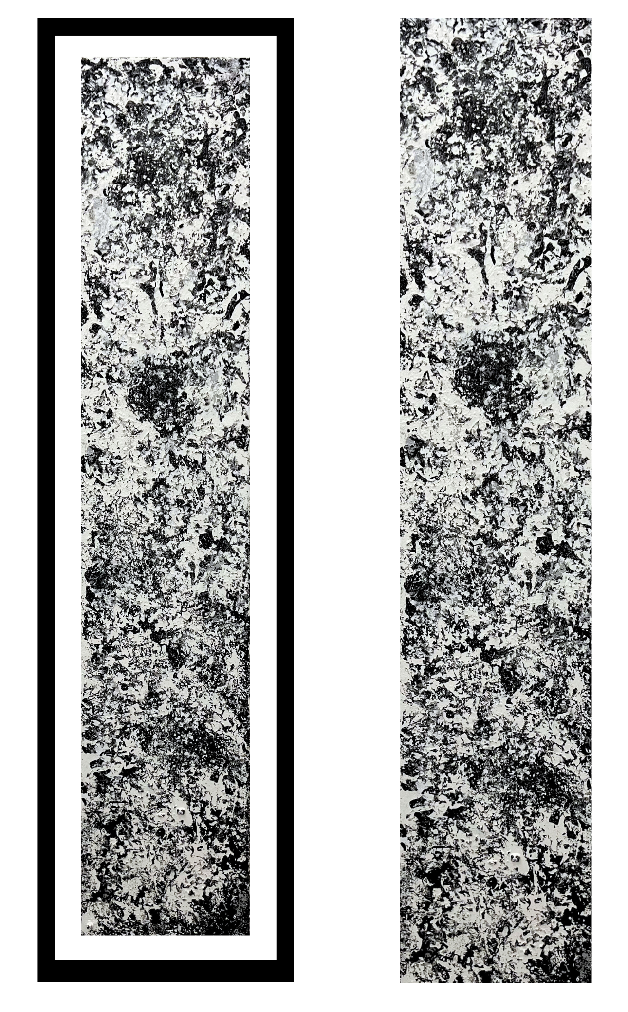 Sous une surface énigmatique de noir profond, de subtiles modulations de blanc et de gris nuancé, la toile se présente comme un secret à déchiffrer. Les reliefs fragmentés deviennent indices, traces gravées dans l’ombre et la lumière, comme un langage silencieux. Chaque empreinte se lit comme une syllabe, chaque clair-obscur comme un mot caché, chaque ombre comme une respiration suspendue.
